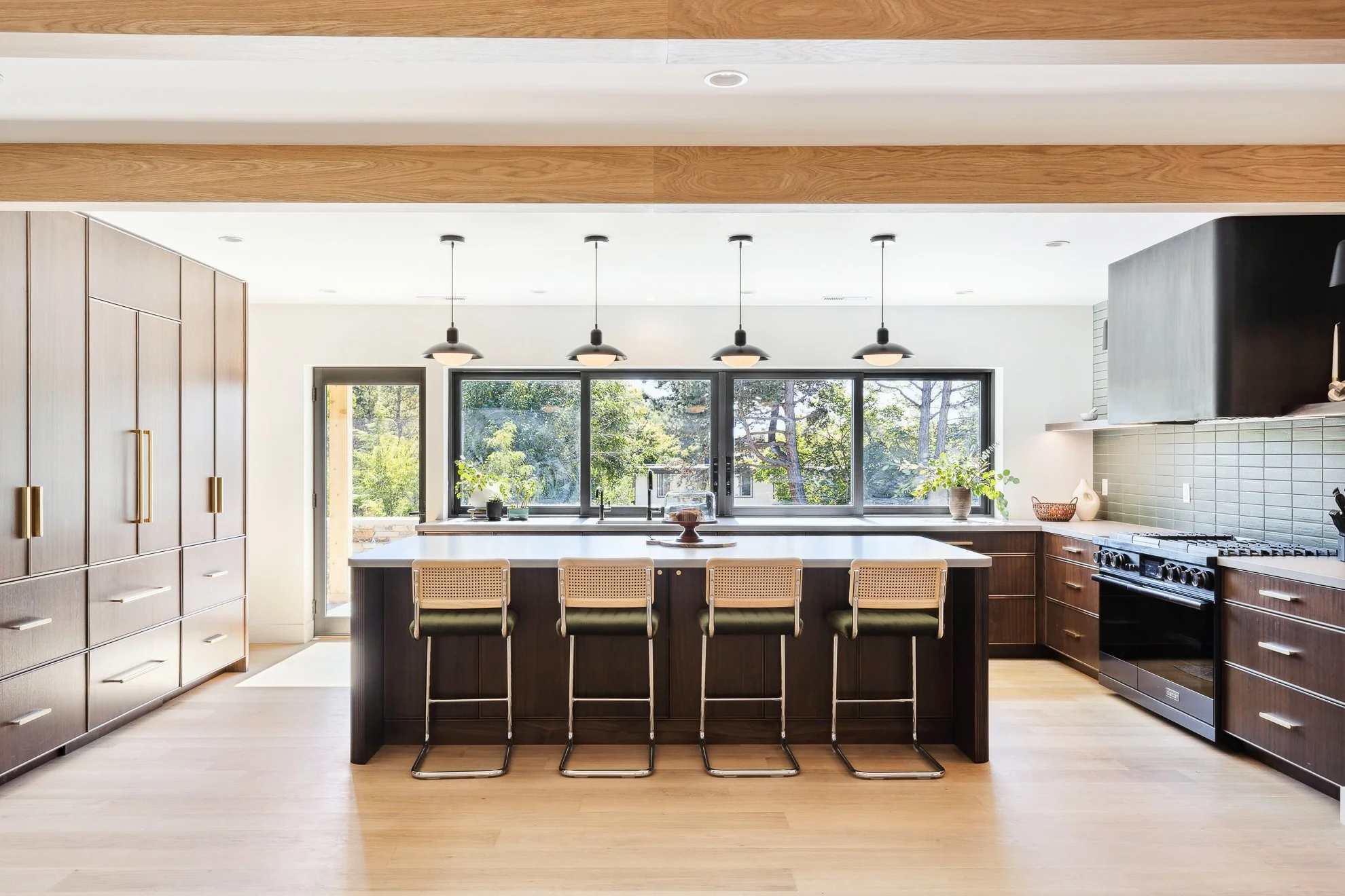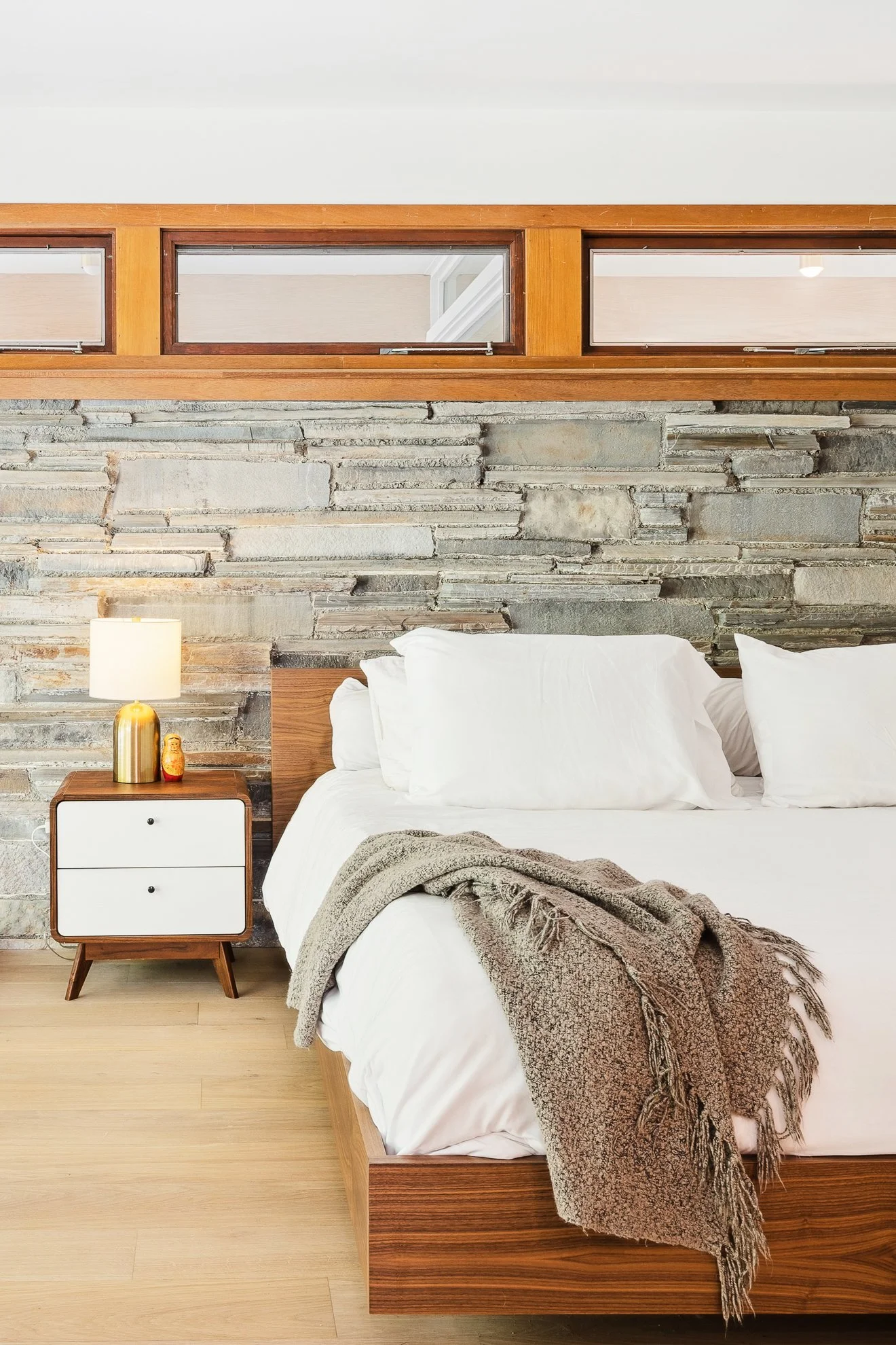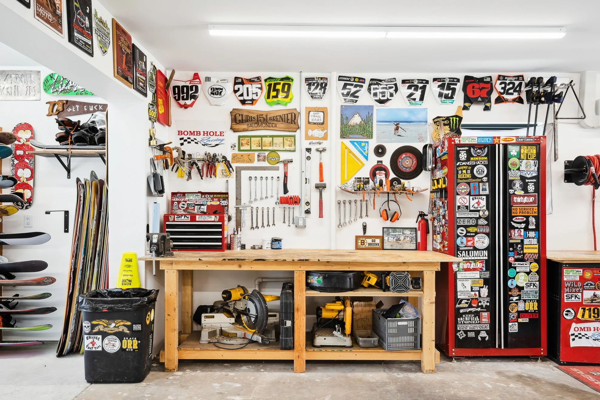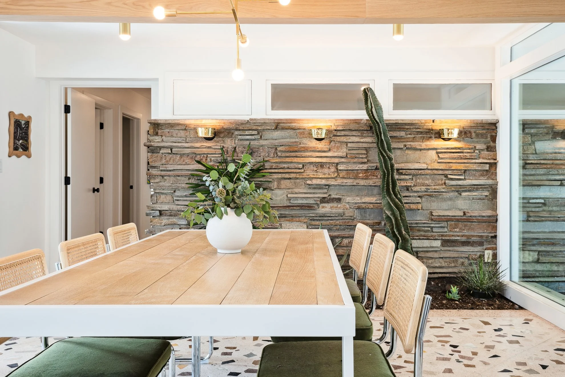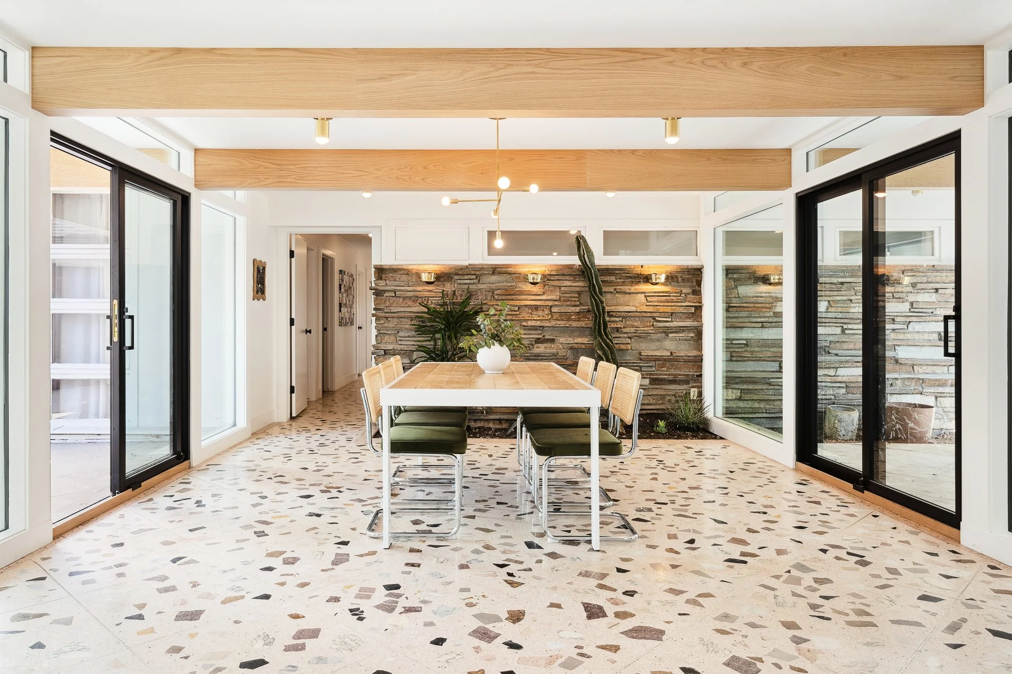 Low-slung windows, stacked stone accents, and a killer terrazzo floor laid the backbone for Russian Olive-inspired subtlety and simple details. Add years of your own pro snowboard models, a healthy dirt bike collection, and an endless network of friends with an eye for custom murals, and the end result is a comfortable home that feels timeless, functional, and playful in the same breath.